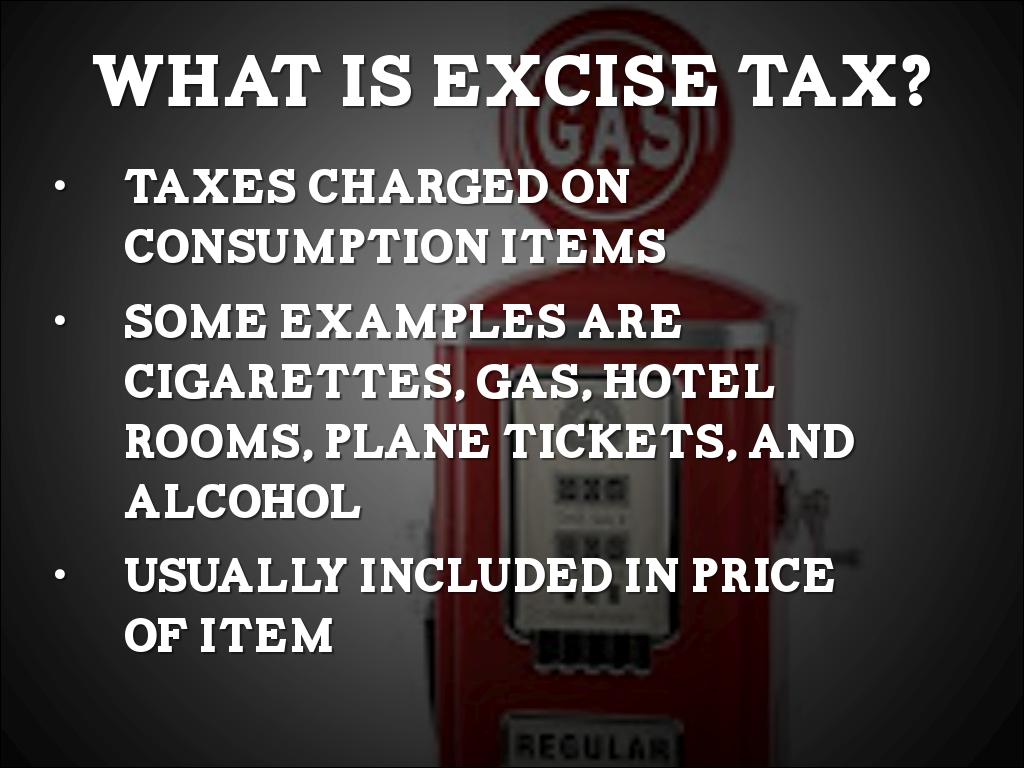 - Some examples are cigarettes, gas, hotel rooms, plane tickets, and alcohol