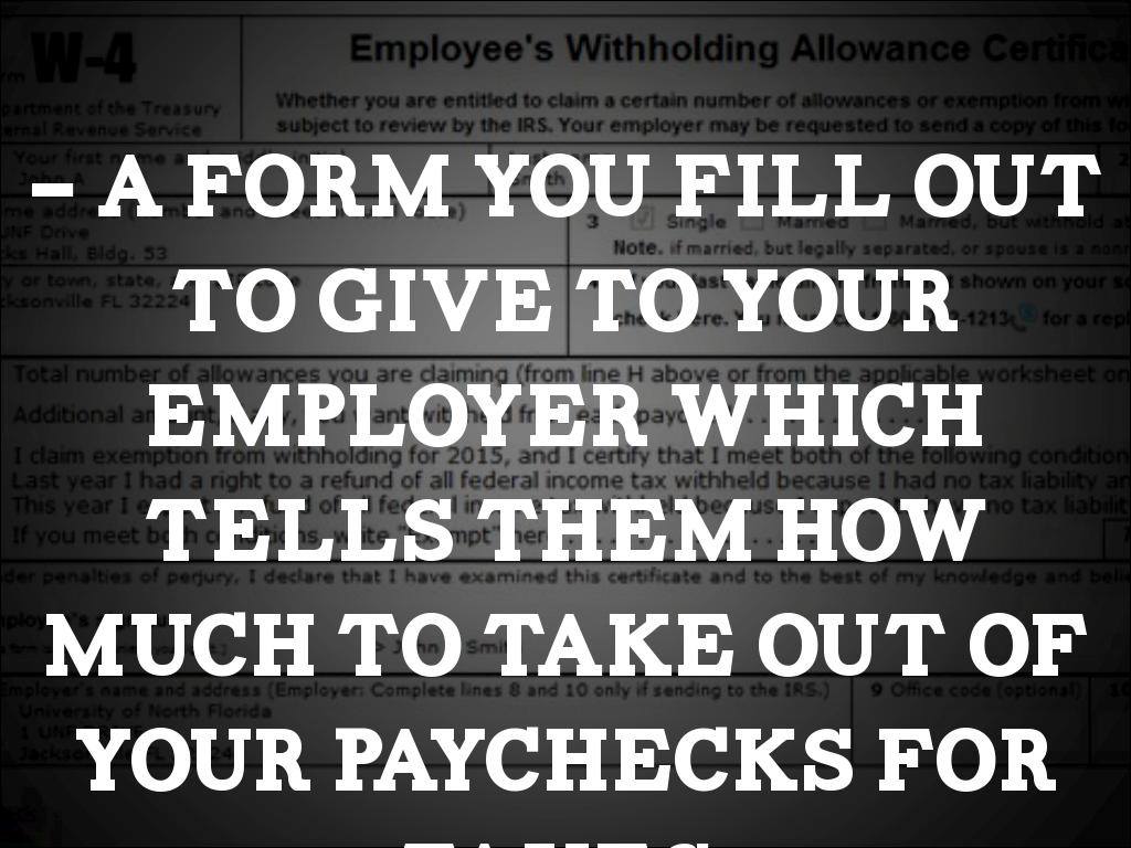 - A form you fill out to give to your employer which tells them how much to take out of your paychecks for taxes.