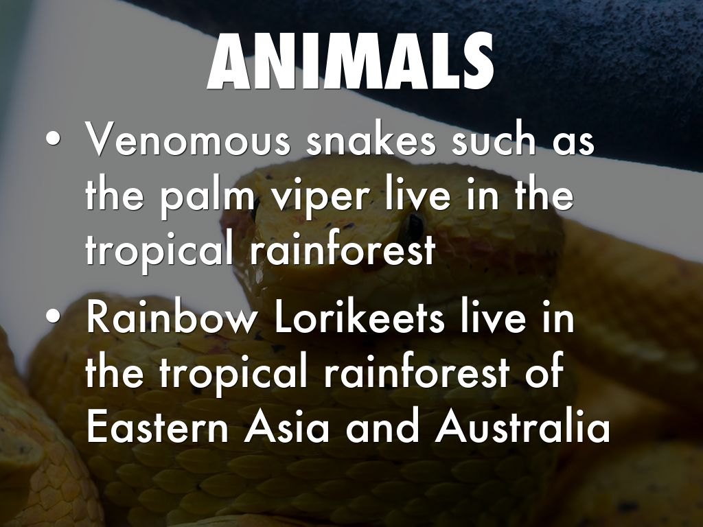 Venomous snakes such as the palm viper live in the tropical rainforest