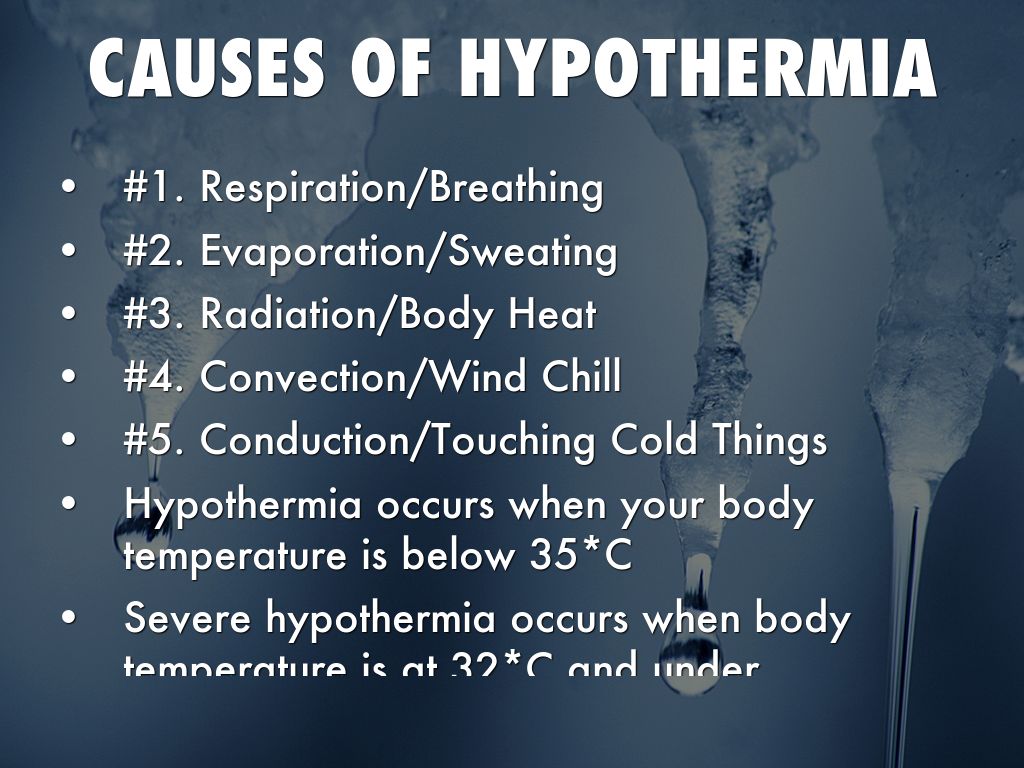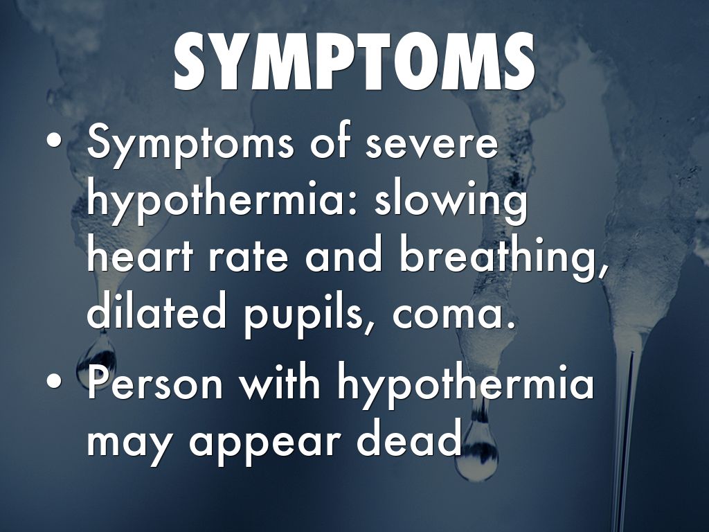Symptoms of severe hypothermia: slowing heart rate and breathing, dilated pupils, coma.