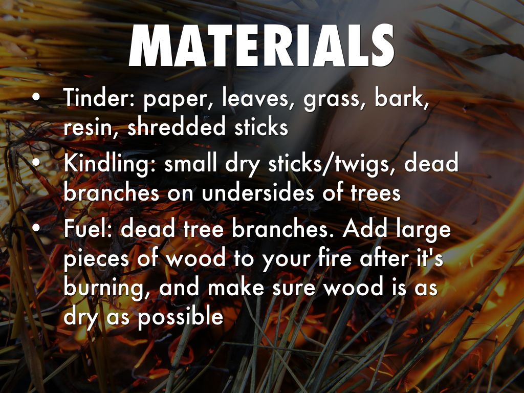 Fuel: dead tree branches. Add large pieces of wood to your fire after it's burning, and make sure wood is as dry as possible