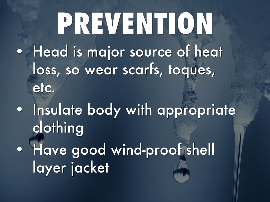 Head is major source of heat loss, so wear scarfs, toques, etc.