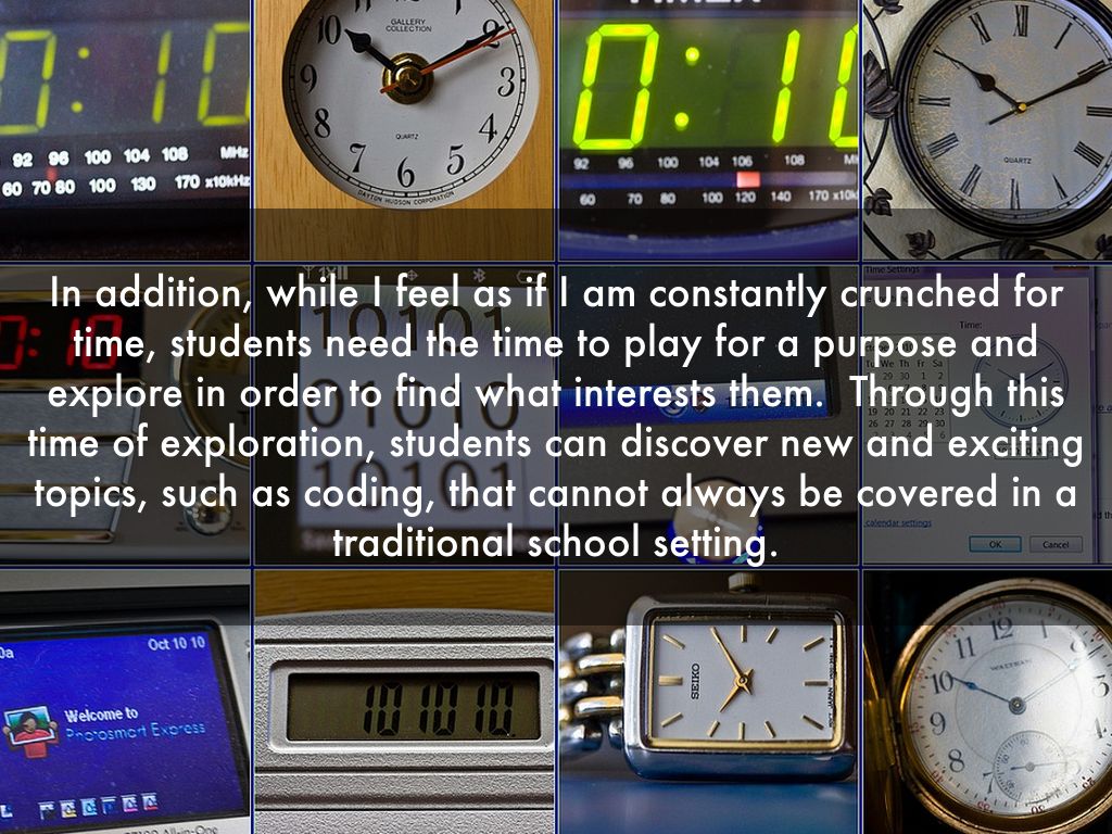 In addition, while I feel as if I am constantly crunched for time, students need the time to play for a purpose and explore in order to find what interests them. Through this time of exploration, students can discover new and exciting topics, such as coding, that cannot always be covered in a traditional school setting.