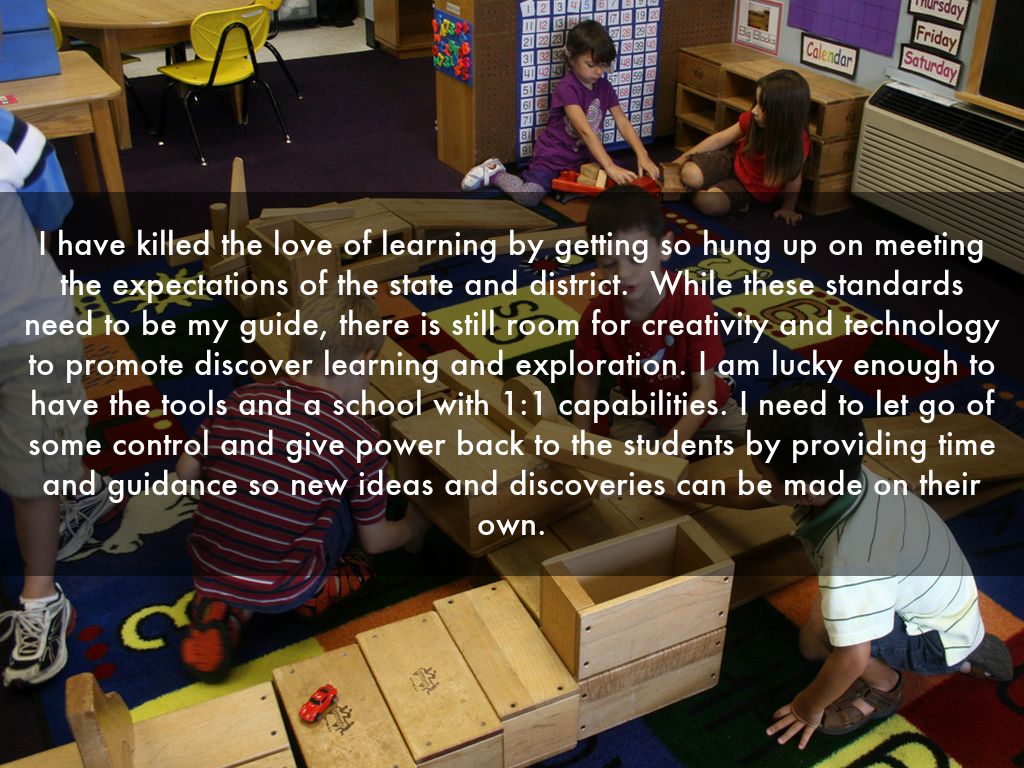 I have killed the love of learning by getting so hung up on meeting the expectations of the state and district. While these standards need to be my guide, there is still room for creativity and technology to promote discover learning and exploration. I am lucky enough to have the tools and a school with 1:1 capabilities. I need to let go of some control and give power back to the students by providing time and guidance so new ideas and discoveries can be made on their own.