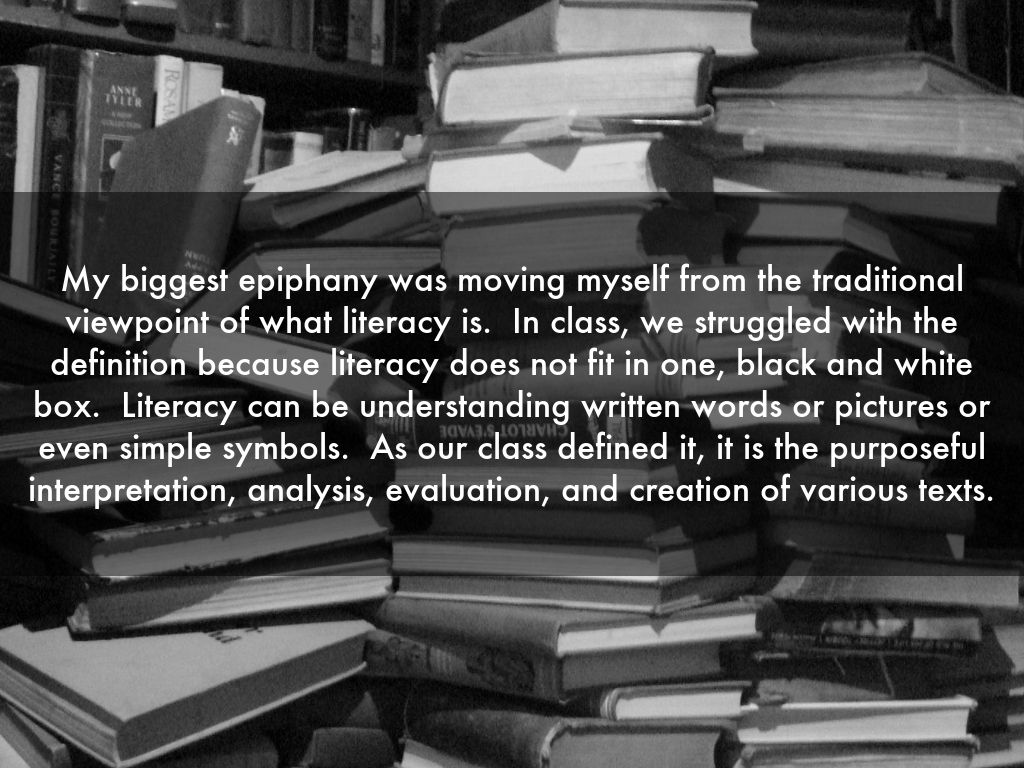 My biggest epiphany was moving myself from the traditional viewpoint of what literacy is. In class, we struggled with the definition because literacy does not fit in one, black and white box. Literacy can be understanding written words or pictures or even simple symbols. As our class defined it, it is the purposeful interpretation, analysis, evaluation, and creation of various texts.