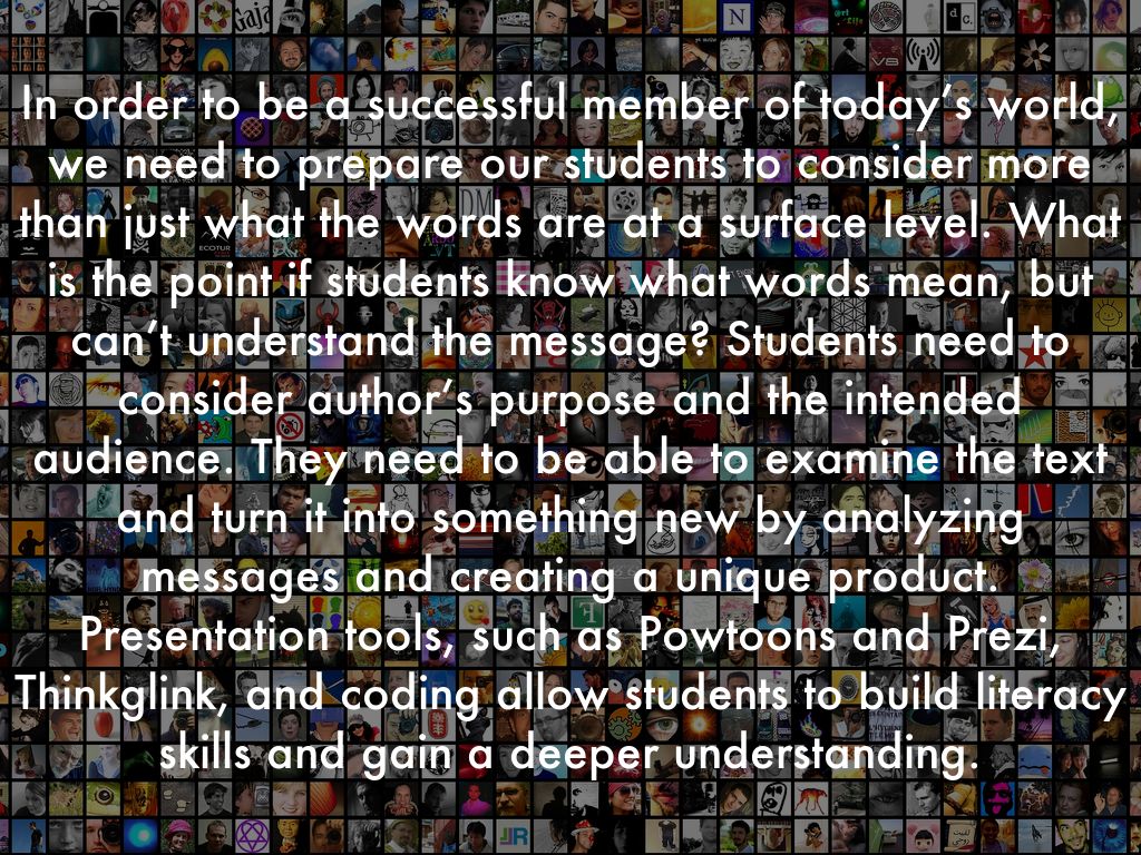 In order to be a successful member of today’s world, we need to prepare our students to consider more than just what the words are at a surface level. What is the point if students know what words mean, but can’t understand the message? Students need to consider author’s purpose and the intended audience. They need to be able to examine the text and turn it into something new by analyzing messages and creating a unique product. Presentation tools, such as Powtoons and Prezi, Thinkglink, and coding allow students to build literacy skills and gain a deeper understanding.