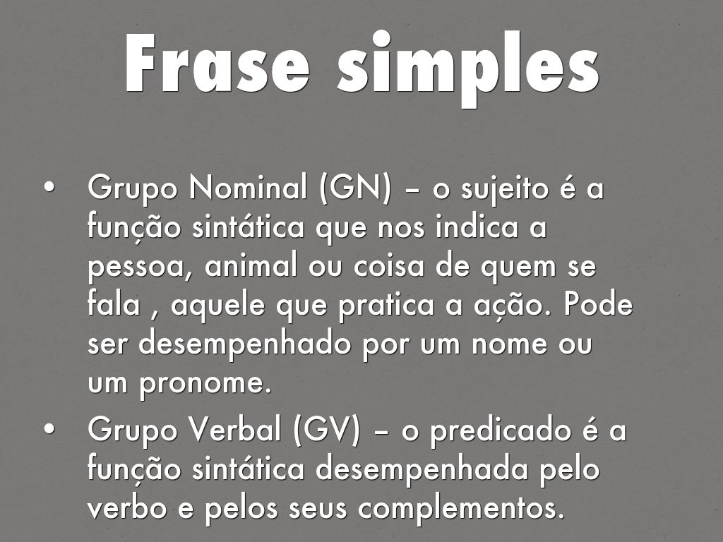 • Grupo Nominal (GN) – o sujeito é a função sintática que nos indica a pessoa, animal ou coisa de quem se fala , aquele que pratica a ação. Pode ser desempenhado por um nome ou um pronome.