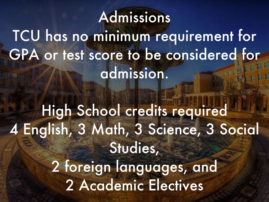 TCU has no minimum requirement for GPA or test score to be considered for admission.
