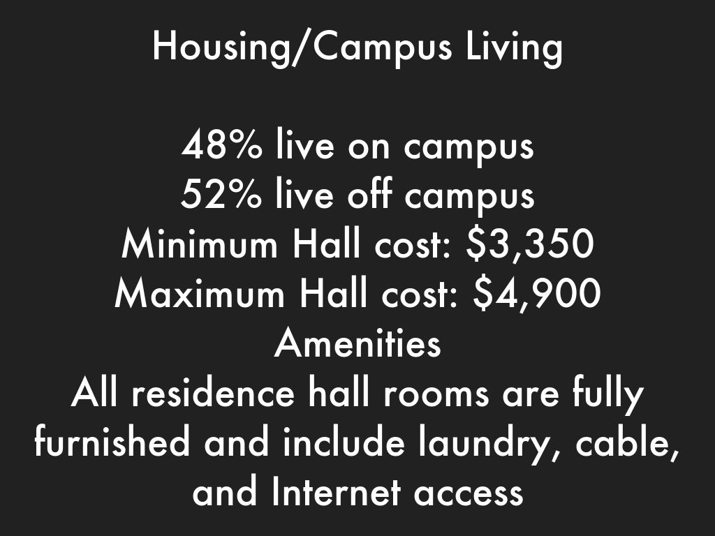 All residence hall rooms are fully furnished and include laundry, cable, and Internet access