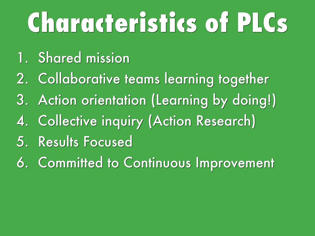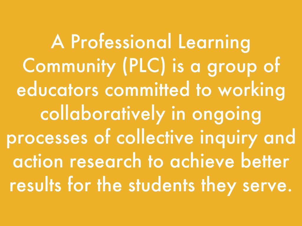 A Professional Learning Community (PLC) is a group of educators committed to working collaboratively in ongoing processes of collective inquiry and action research to achieve better results for the students they serve.
