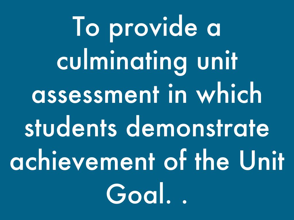 To provide a culminating unit assessment in which students demonstrate achievement of the Unit Goal. .