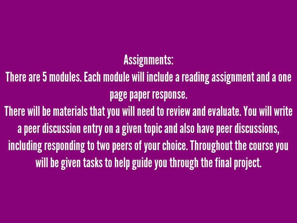 There are 5 modules. Each module will include a reading assignment and a one page paper response.