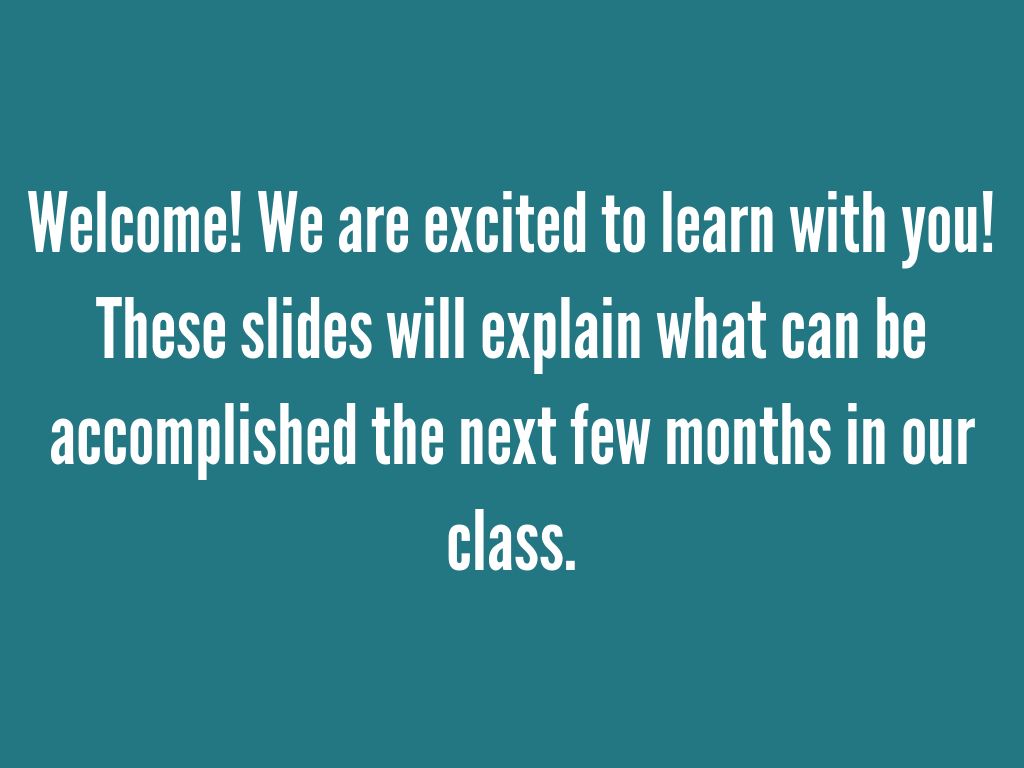 Welcome! We are excited to learn with you! These slides will explain what can be accomplished the next few months in our class.