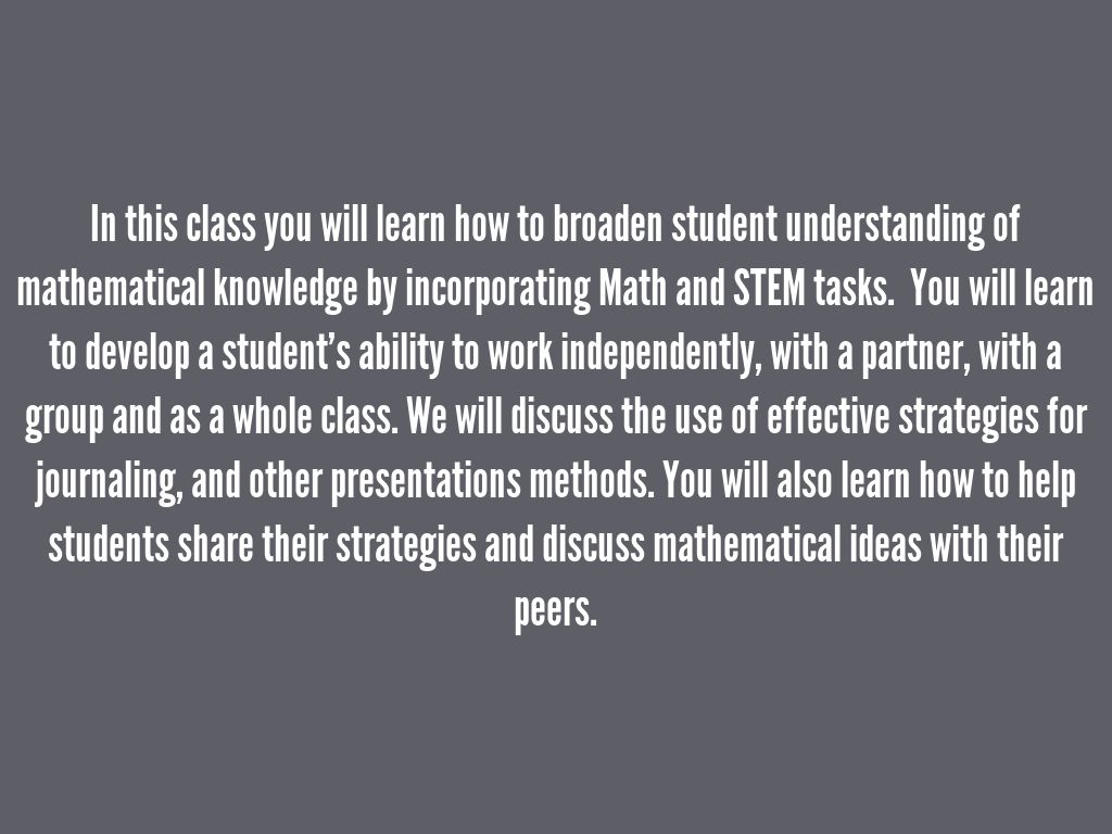 In this class you will learn how to broaden student understanding of mathematical knowledge by incorporating Math and STEM tasks. You will learn to develop a student’s ability to work independently, with a partner, with a group and as a whole class. We will discuss the use of effective strategies for journaling, and other presentations methods. You will also learn how to help students share their strategies and discuss mathematical ideas with their peers.