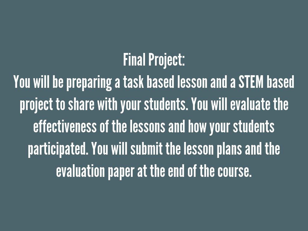 You will be preparing a task based lesson and a STEM based project to share with your students. You will evaluate the effectiveness of the lessons and how your students participated. You will submit the lesson plans and the evaluation paper at the end of the course.