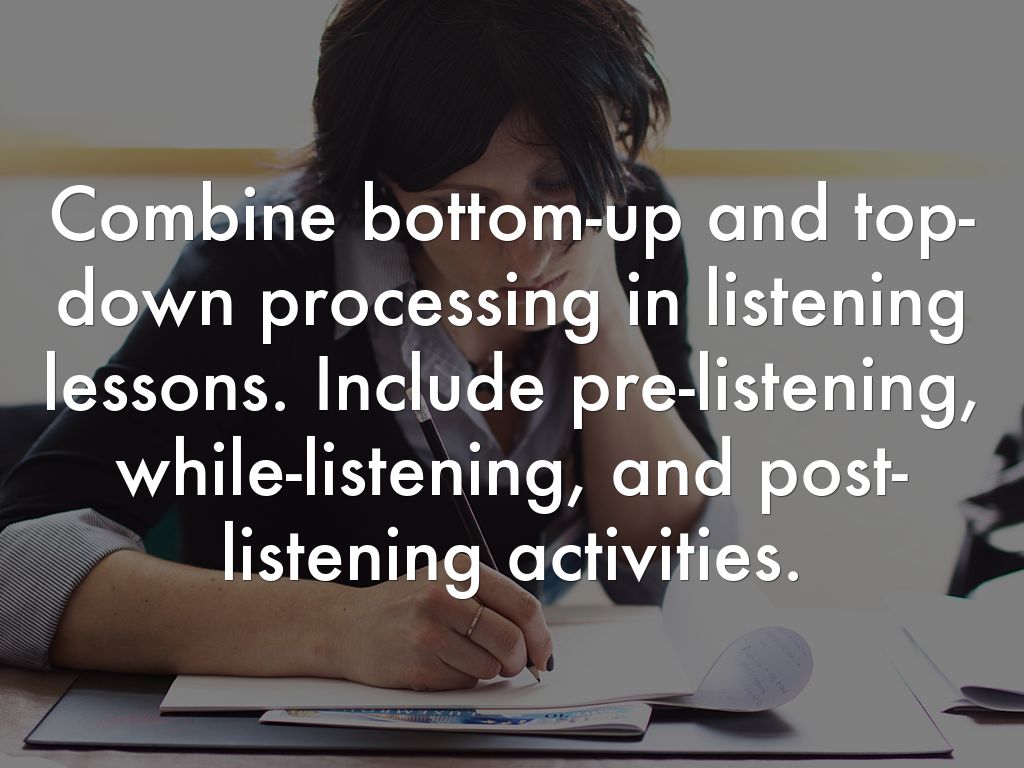 Combine bottom-up and top-down processing in listening lessons. Include pre-listening, while-listening, and post-listening activities.