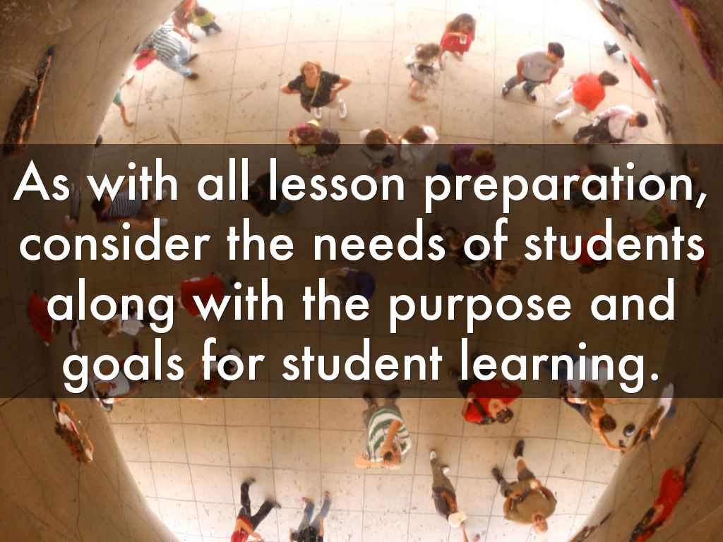 As with all lesson preparation, consider the needs of students along with the purpose and goals for student learning.