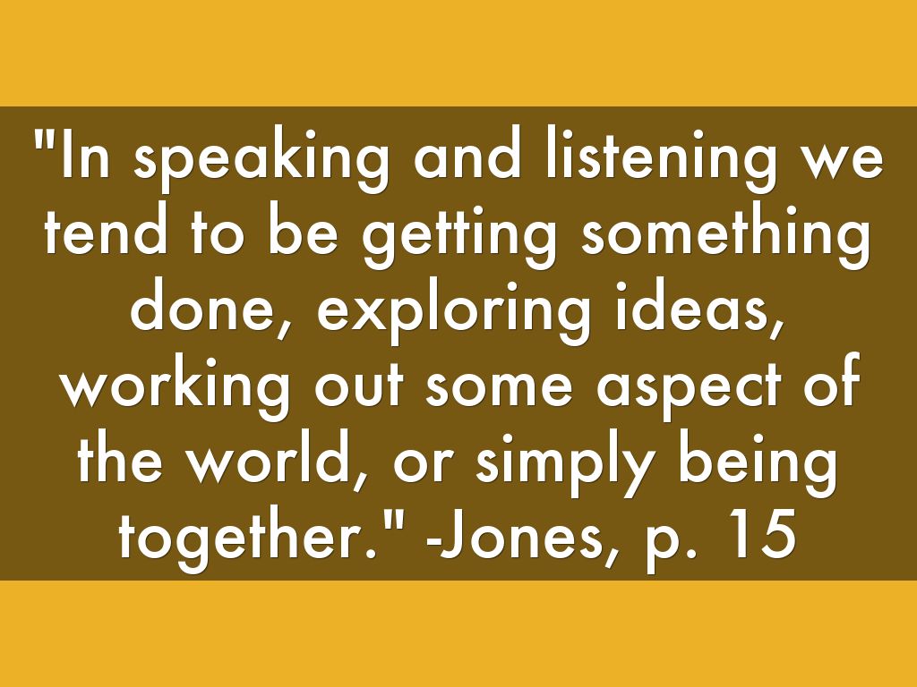 "In speaking and listening we tend to be getting something done, exploring ideas, working out some aspect of the world, or simply being together." -Jones, p. 15