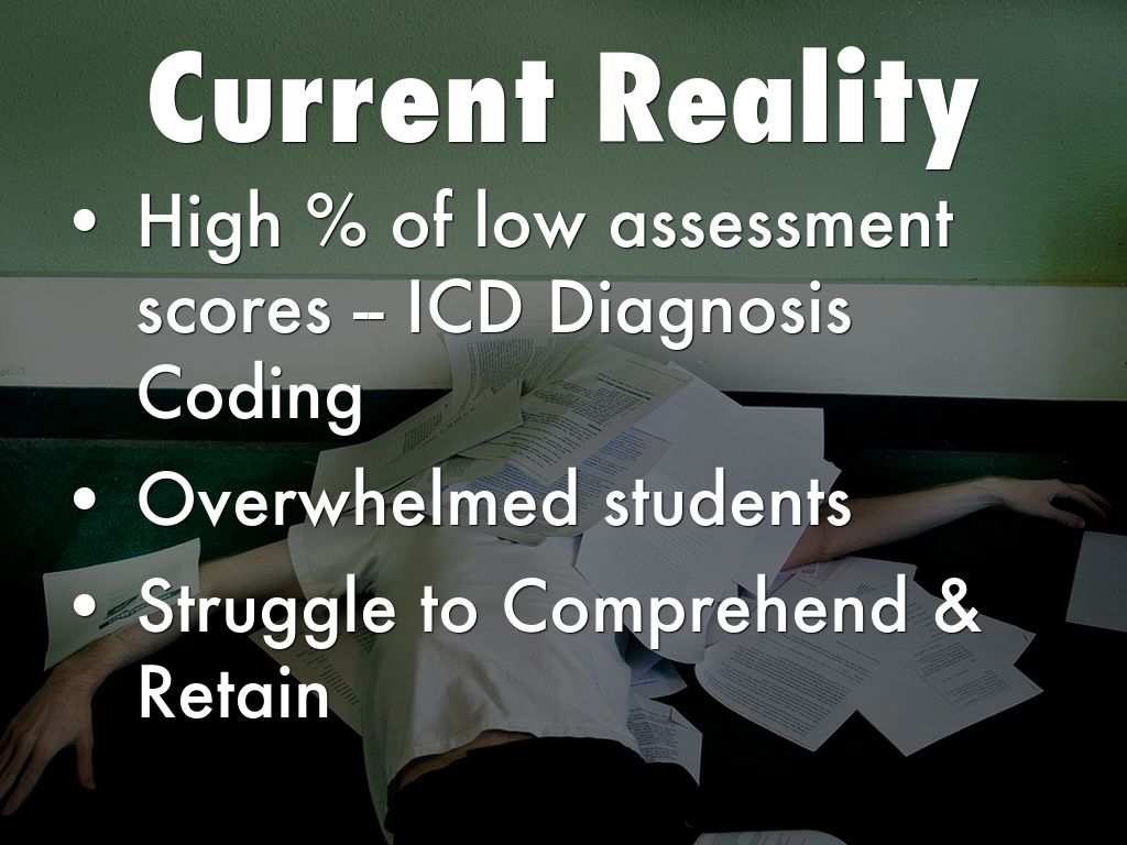 - High % of low assessment scores -- ICD Diagnosis Coding