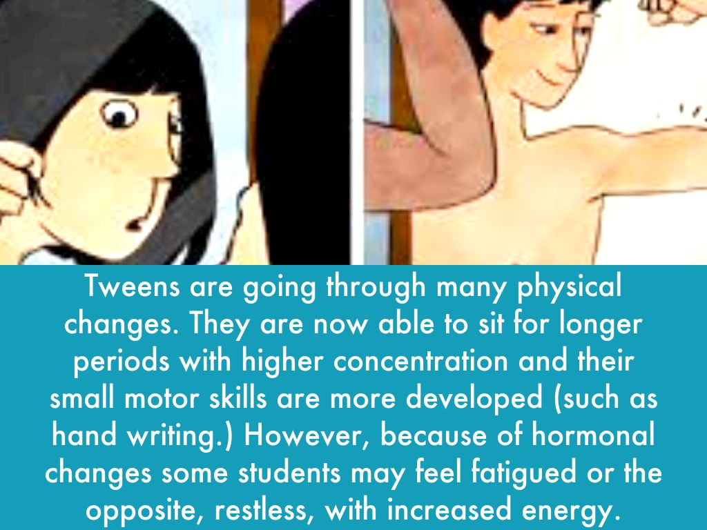 Tweens are going through many physical changes. They are now able to sit for longer periods with higher concentration and their small motor skills are more developed (such as hand writing.) However, because of hormonal changes some students may feel fatigued or the opposite, restless, with increased energy.