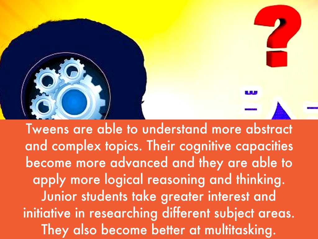 Tweens are able to understand more abstract and complex topics. Their cognitive capacities become more advanced and they are able to apply more logical reasoning and thinking. Junior students take greater interest and initiative in researching different subject areas. They also become better at multitasking.