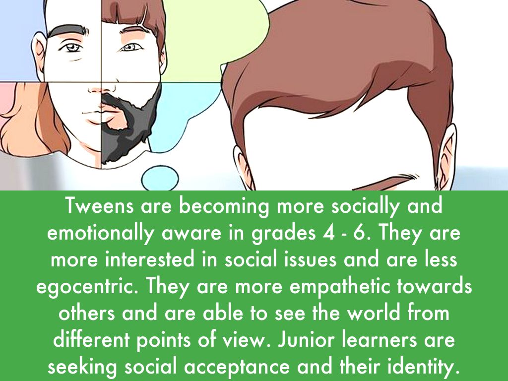 Tweens are becoming more socially and emotionally aware in grades 4 - 6. They are more interested in social issues and are less egocentric. They are more empathetic towards others and are able to see the world from different points of view. Junior learners are seeking social acceptance and their identity.