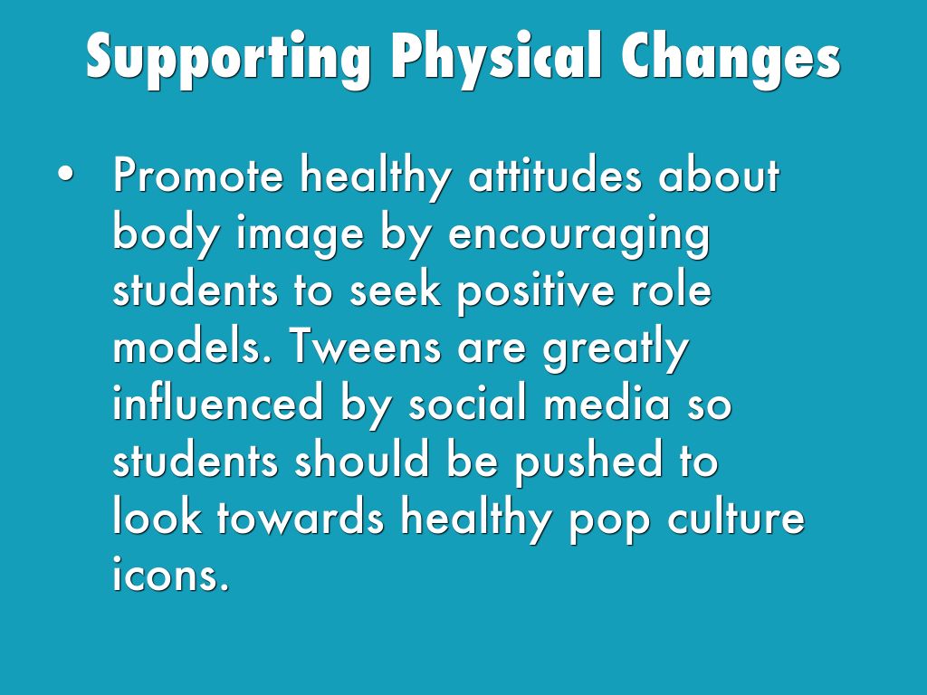 - Promote healthy attitudes about body image by encouraging students to seek positive role models. Tweens are greatly influenced by social media so students should be pushed to look towards healthy pop culture icons.