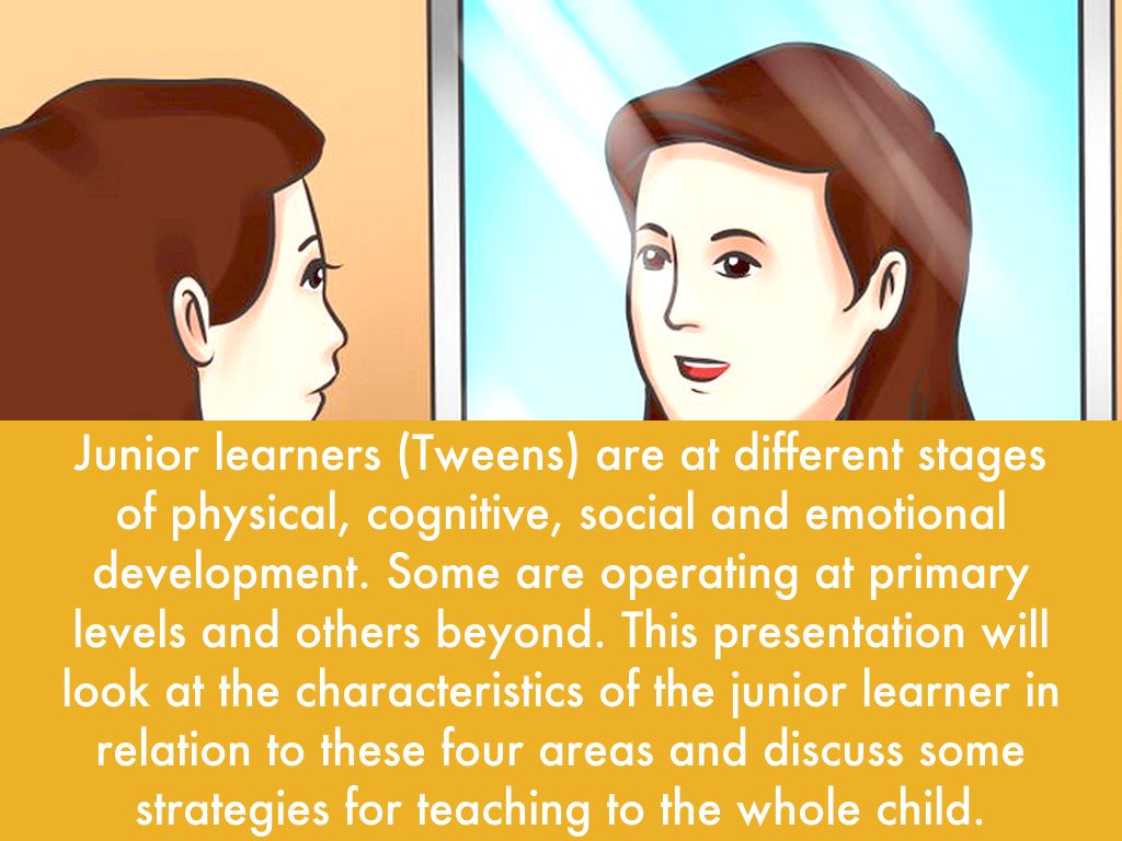 Junior learners (Tweens) are at different stages of physical, cognitive, social and emotional development. Some are operating at primary levels and others beyond. This presentation will look at the characteristics of the junior learner in relation to these four areas and discuss some strategies for teaching to the whole child.