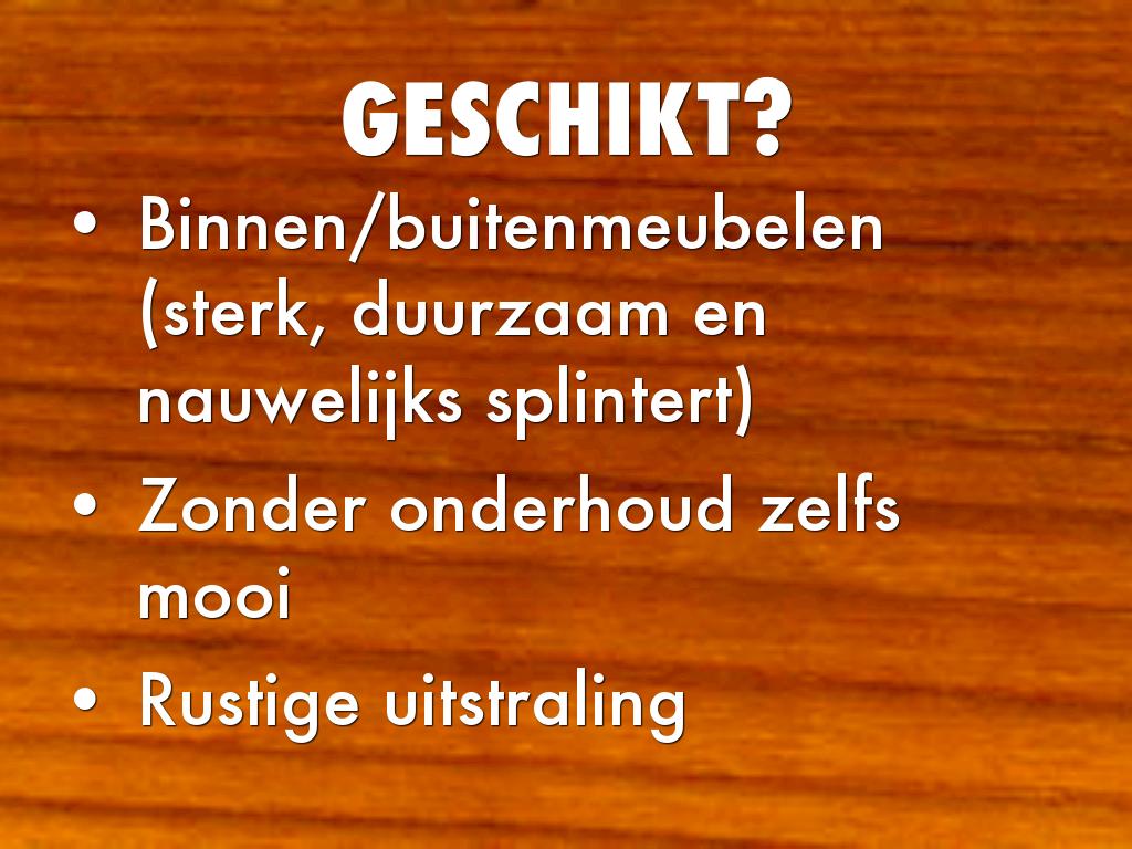 • Binnen/buitenmeubelen (sterk, duurzaam en nauwelijks splintert)