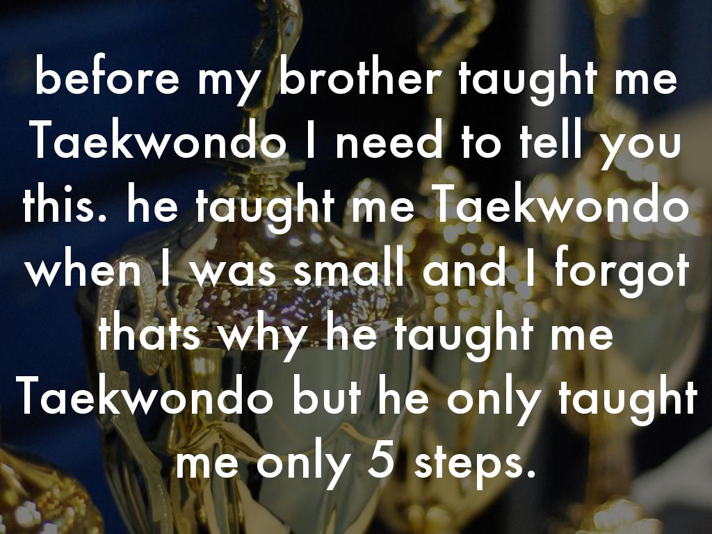before my brother taught me Taekwondo I need to tell you this. he taught me Taekwondo when I was small and I forgot thats why he taught me Taekwondo but he only taught me only 5 steps.
