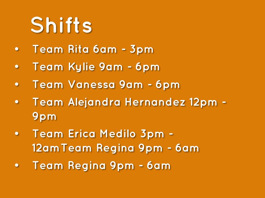 Team Erica Medilo 3pm - 12amTeam Regina 9pm - 6am
