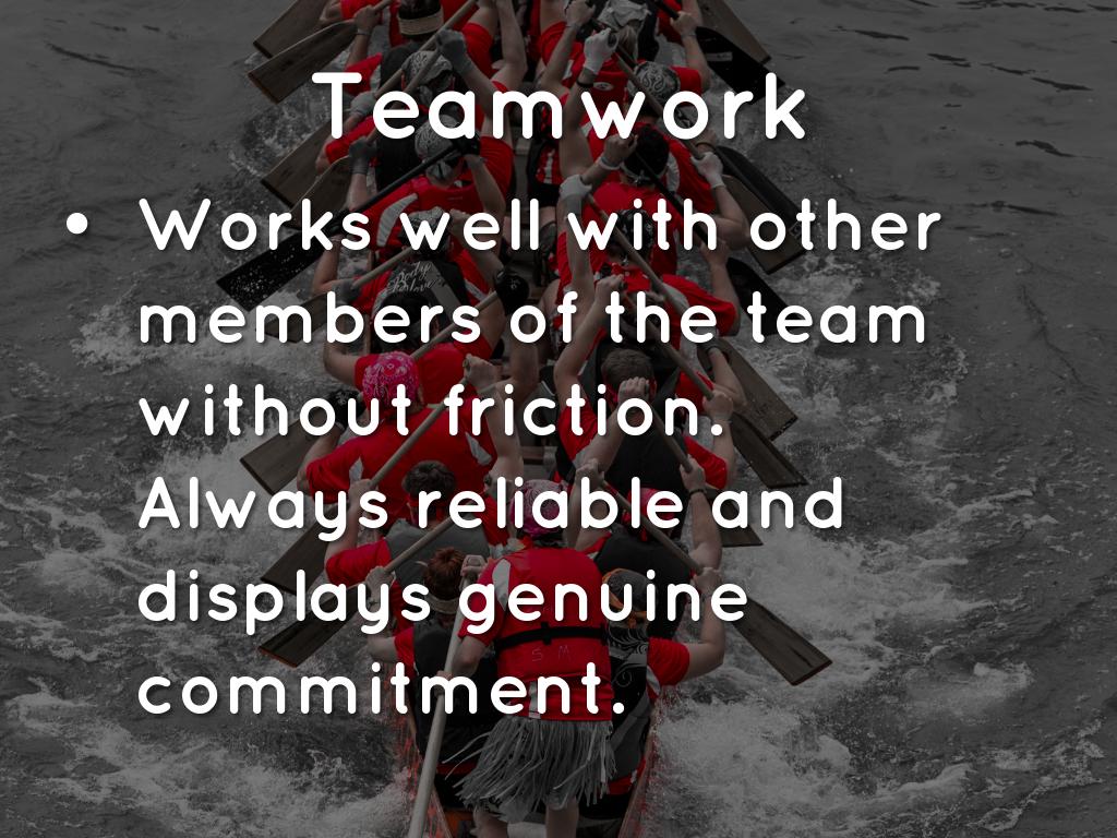 Works well with other members of the team without friction. Always reliable and displays genuine commitment.