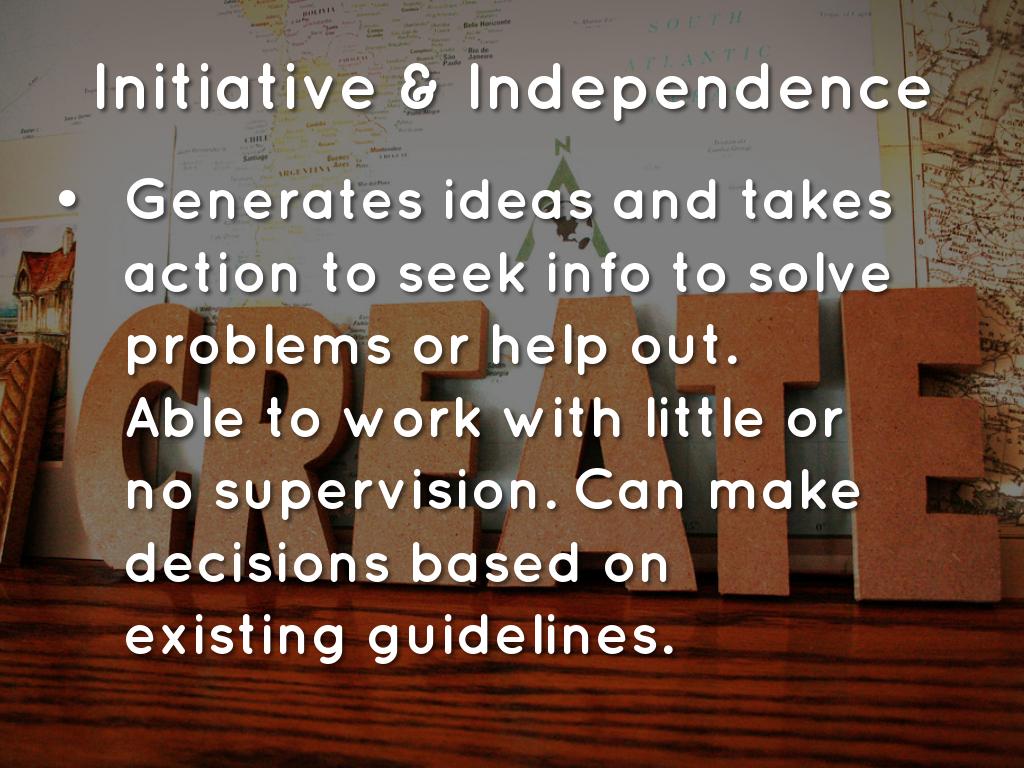 Generates ideas and takes action to seek info to solve problems or help out. Able to work with little or no supervision. Can make decisions based on existing guidelines.