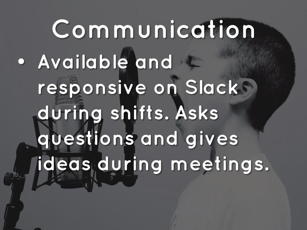 Available and responsive on Slack during shifts. Asks questions and gives ideas during meetings.