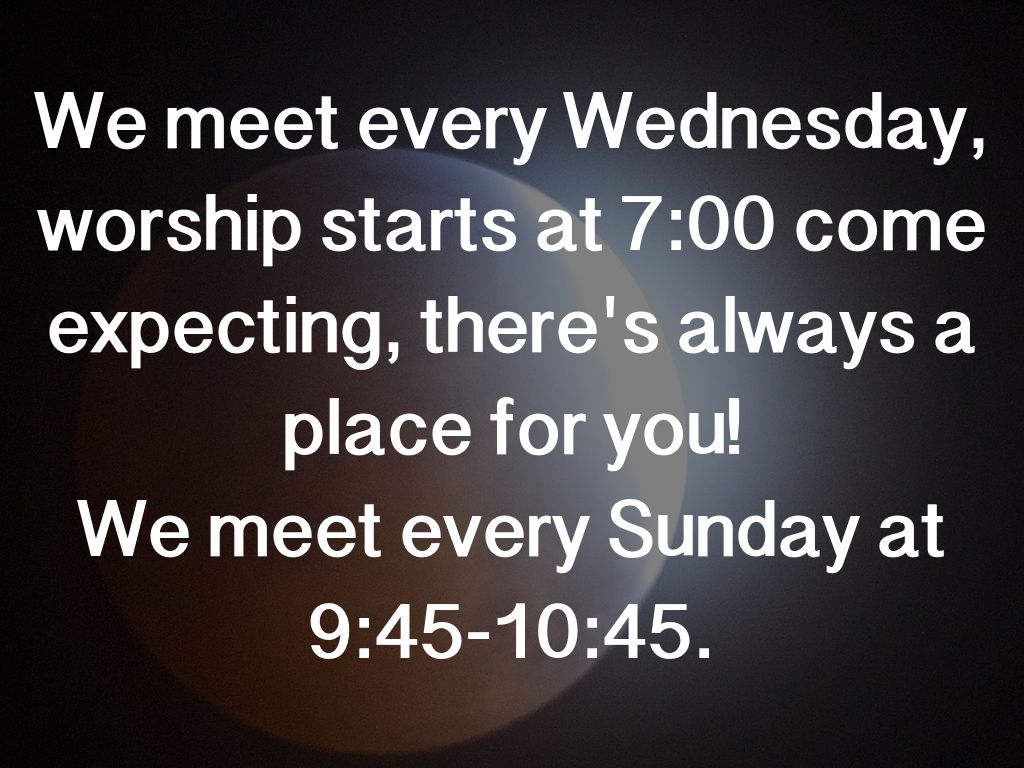 We meet every Wednesday, worship starts at 7:00 come expecting, there's always a place for you!