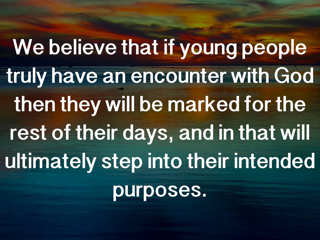 We believe that if young people truly have an encounter with God then they will be marked for the rest of their days, and in that will ultimately step into their intended purposes.