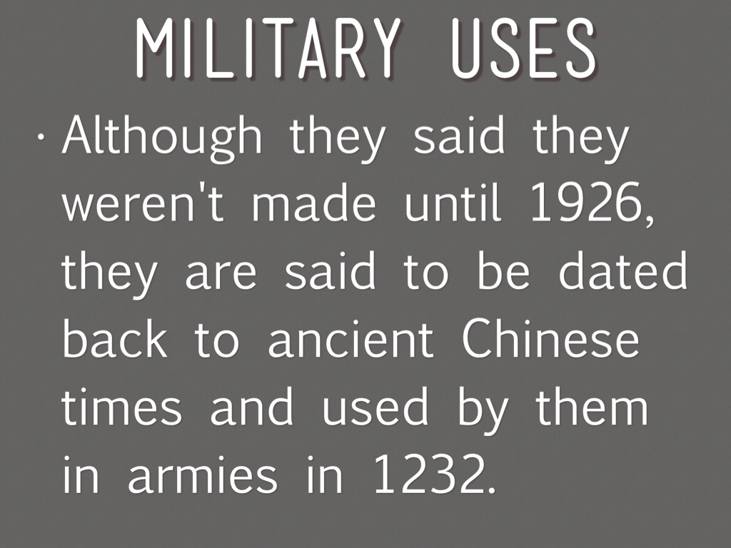 Although they said they weren't made until 1926, they are said to be dated back to ancient Chinese times and used by them in armies in 1232.