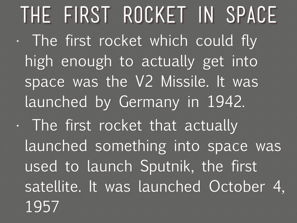 The first rocket that actually launched something into space was used to launch Sputnik, the first satellite. It was launched October 4, 1957