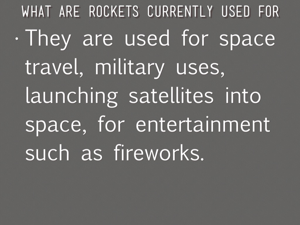 They are used for space travel, military uses, launching satellites into space, for entertainment such as fireworks.