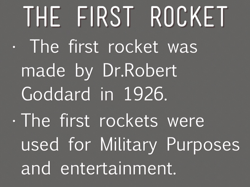 The first rocket was made by Dr.Robert Goddard in 1926.
