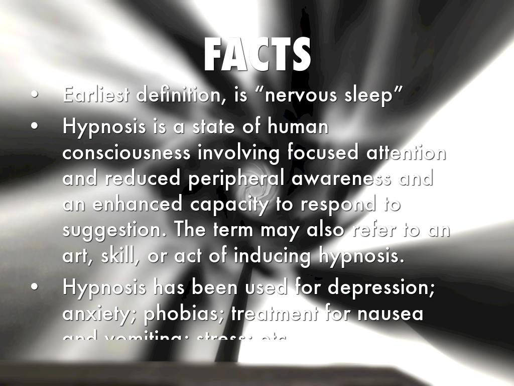 Hypnosis is a state of human consciousness involving focused attention and reduced peripheral awareness and an enhanced capacity to respond to suggestion. The term may also refer to an art, skill, or act of inducing hypnosis.