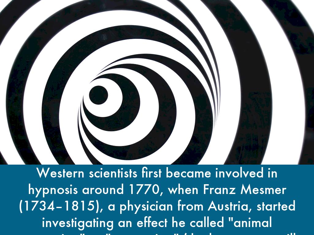Western scientists first became involved in hypnosis around 1770, when Franz Mesmer (1734–1815), a physician from Austria, started investigating an effect he called "animal magnetism" or "mesmerism" (the latter name still remaining popular today).