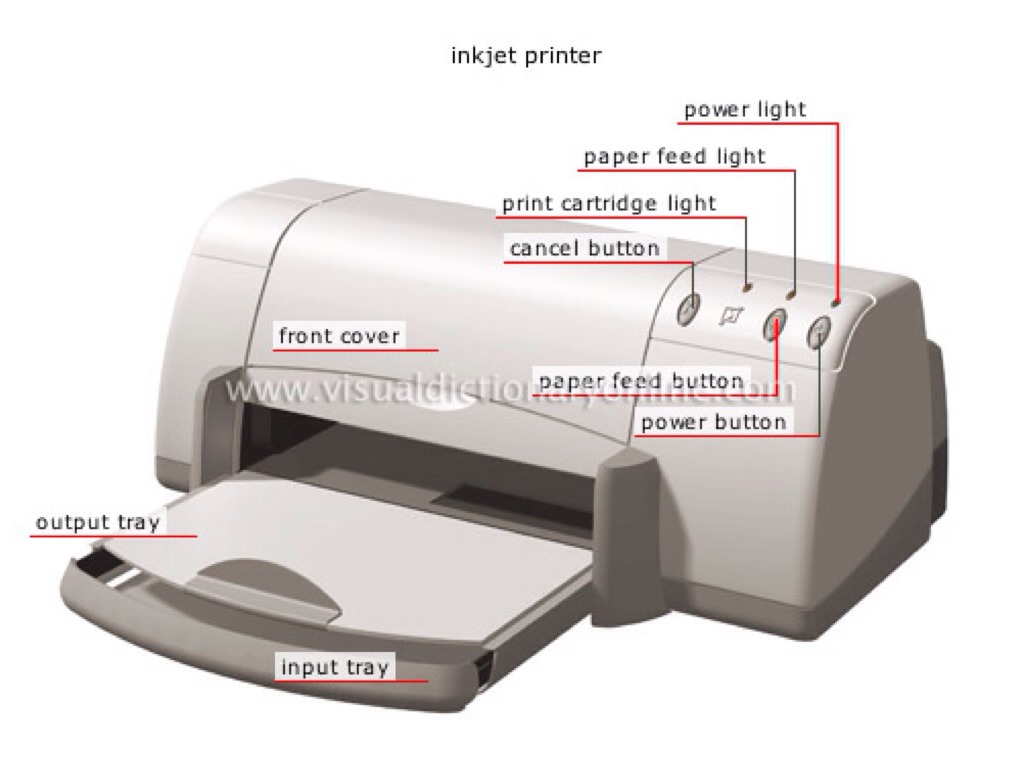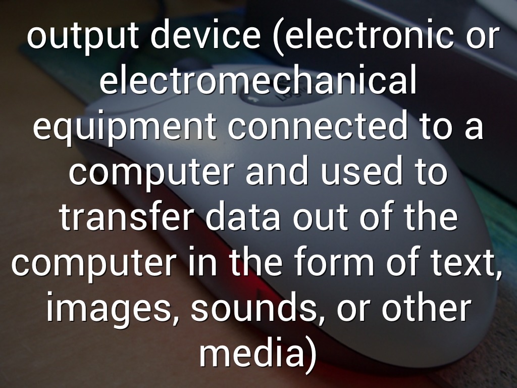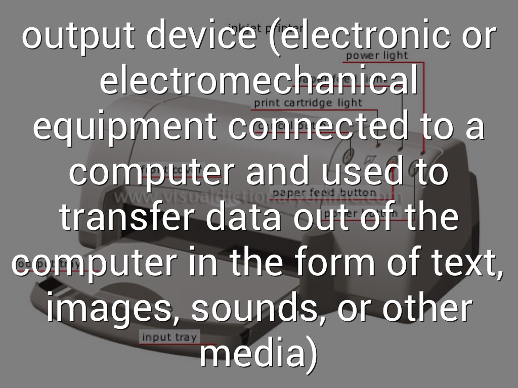 output device (electronic or electromechanical equipment connected to a computer and used to transfer data out of the computer in the form of text, images, sounds, or other media)