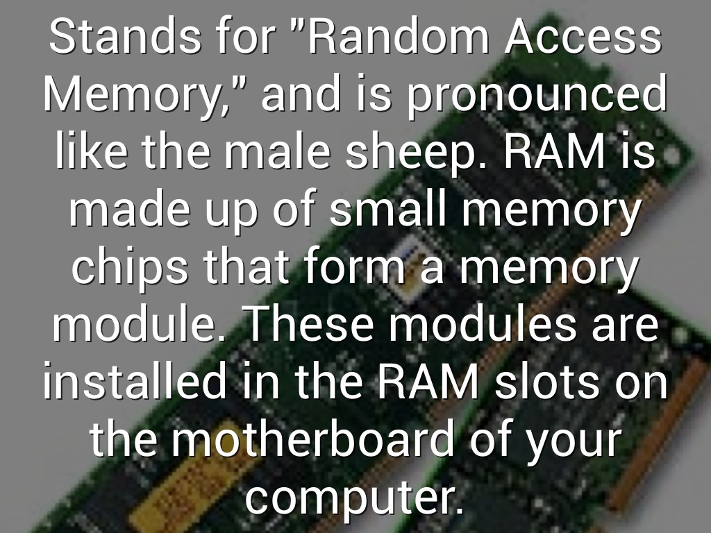 Stands for "Random Access Memory," and is pronounced like the male sheep. RAM is made up of small memory chips that form a memory module. These modules are installed in the RAM slots on the motherboard of your computer.