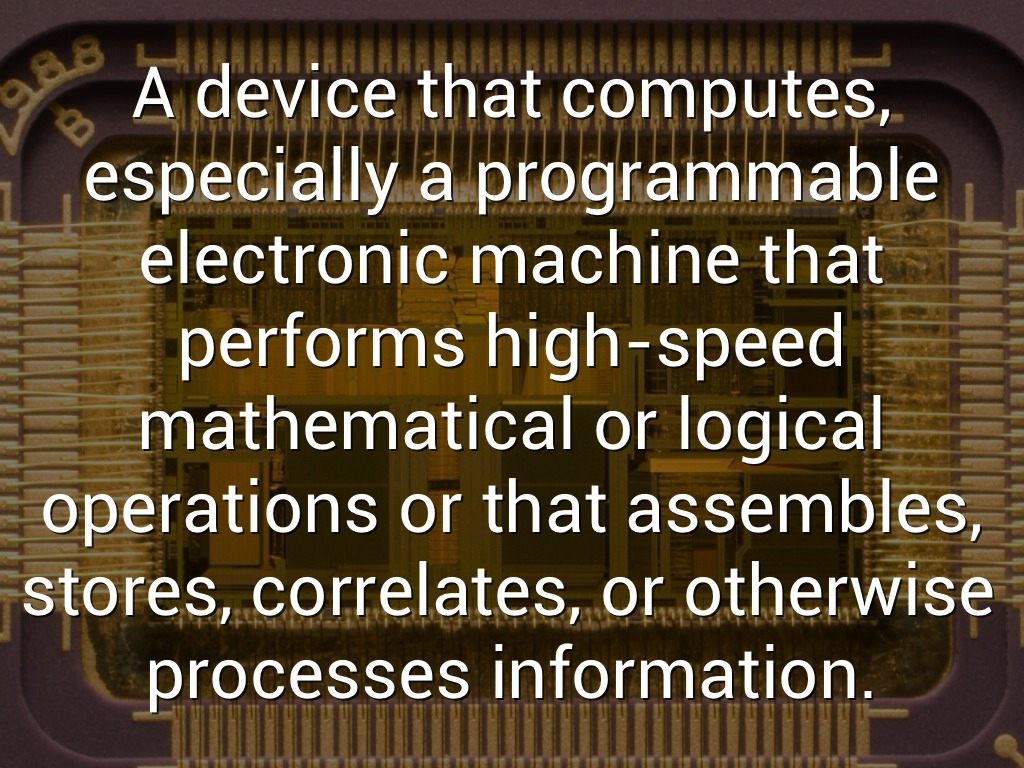 A device that computes, especially a programmable electronic machine that performs high-speed mathematical or logical operations or that assembles, stores, correlates, or otherwise processes information.
