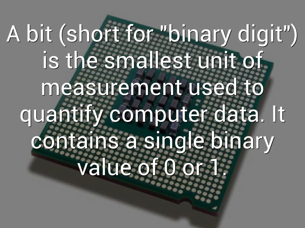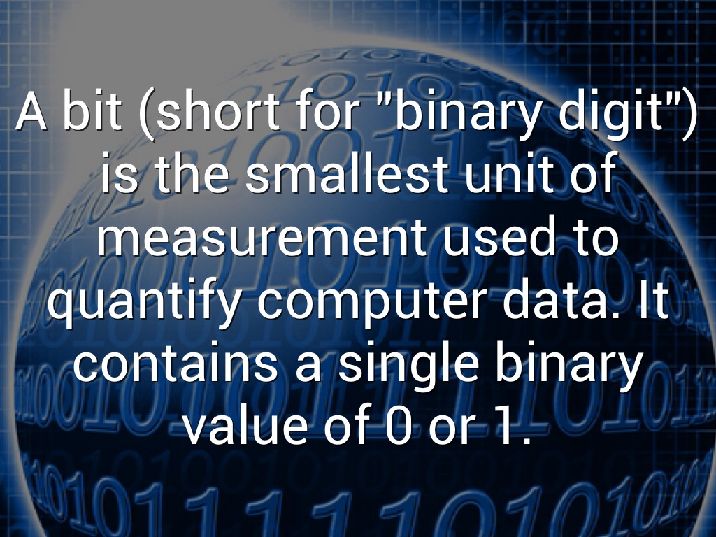 A bit (short for "binary digit") is the smallest unit of measurement used to quantify computer data. It contains a single binary value of 0 or 1.