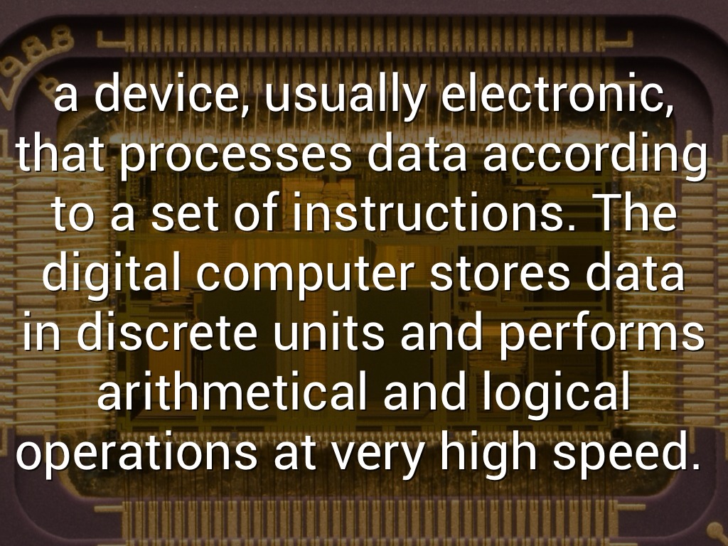 a device, usually electronic, that processes data according to a set of instructions. The digital computer stores data in discrete units and performs arithmetical and logical operations at very high speed.