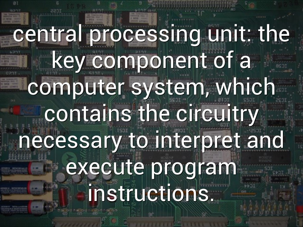 central processing unit: the key component of a computer system, which contains the circuitry necessary to interpret and execute program instructions.