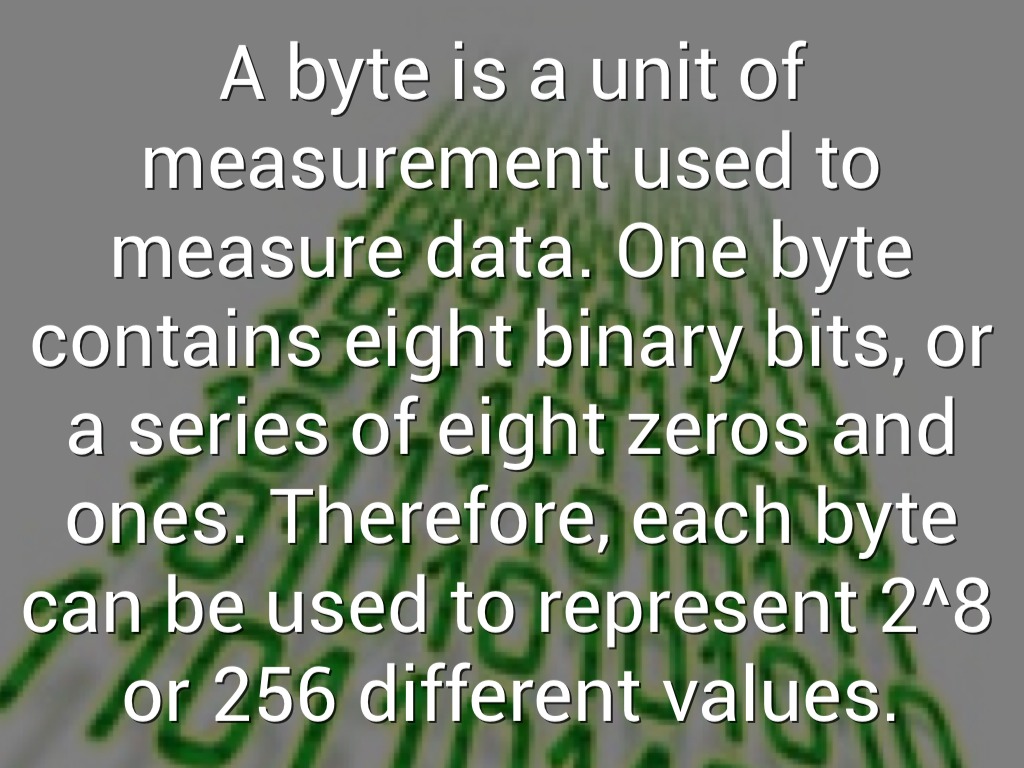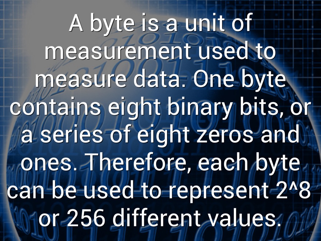 A byte is a unit of measurement used to measure data. One byte contains eight binary bits, or a series of eight zeros and ones. Therefore, each byte can be used to represent 2^8 or 256 different values.