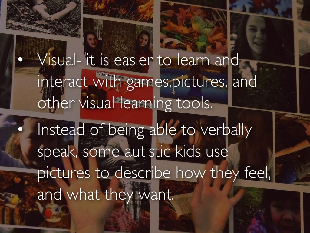 • Instead of being able to verbally speak, some autistic kids use pictures to describe how they feel, and what they want.
